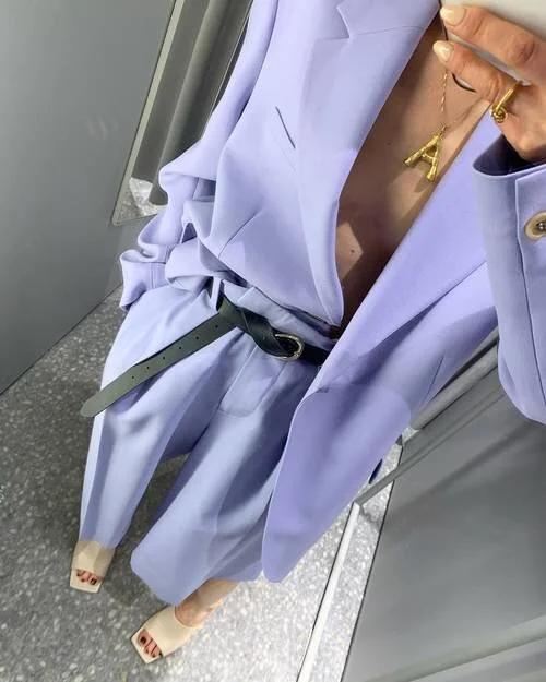 We’ve seen this trend styled nearly every way with other bolds colors, monochromatic palates and of course – neutrals. We suggest a monochromatic ensemble with other hues of purple, mauve or lilac. Or we are seeing purple pair exceptionally well with forest or army like green shades.
